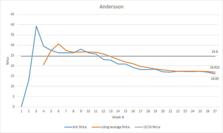 This chart doesn’t look great for Andersson, but there’s some things to consider. Firstly, he’s no longer a 19-year-old in the OHL, where points come easy, so comparing his current NHLe to his D+1 NHLe isn’t exactly a fair comparison. In his first pro season, he still put up better results than most veterans did on the team.