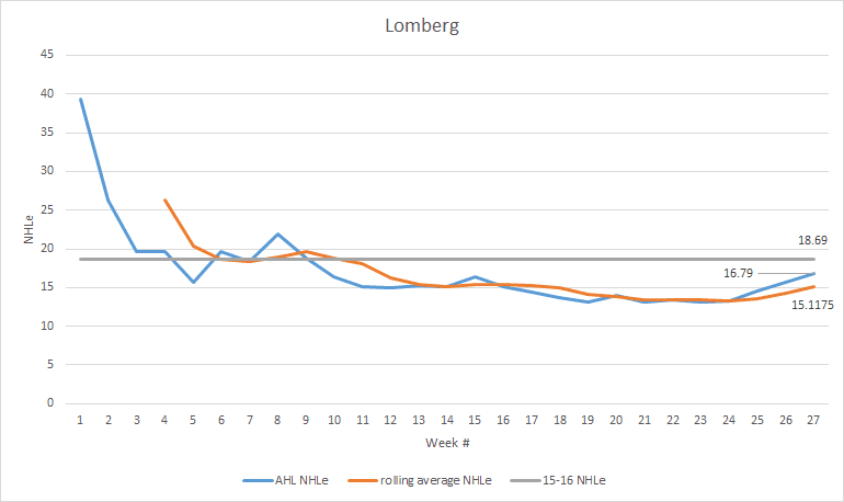Lomberg slowed down after a pretty hot start to the season, but was one of the most consistent Heat players on a week-to-week basis. I wouldn’t be too concerned about him dipping from the year previous because he was a first liner in the ECHL and a third liner in the AHL. If he had a few more minutes on the ice, he might be hovering around that 20 NHLe mark.