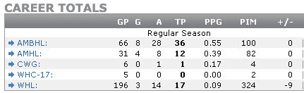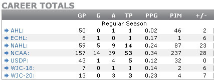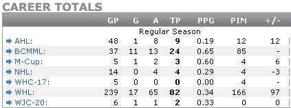 237 PIMs over 157 games and maintained a +/- 28. Short AHL career thus far of