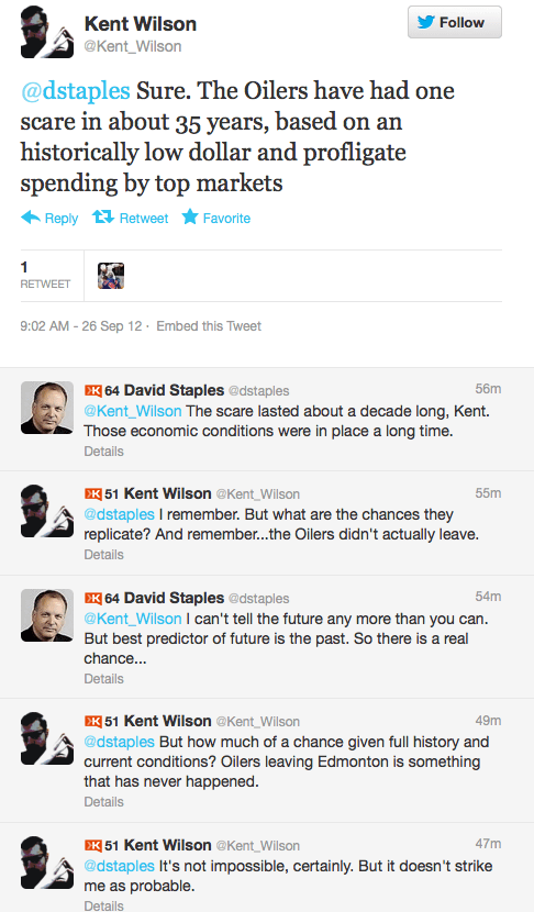 This is why I set about asking David just how likely the chances the Oilers leaving Edmonton are. As an Oilers fan, he’s obviously agitated by the thought of them being moved, so I suspect that’s causing him to overweight the actual probability of it happening.