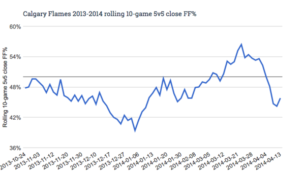 – In December of 2013, it looked like the Flames would be battling the Sabres for last overall. From about the middle of November to the start of the new year, the club was lousy – they couldn’t score, the goaltending was mediocre and they were putting up league worst possession numbers on most nights. Things were grim.
