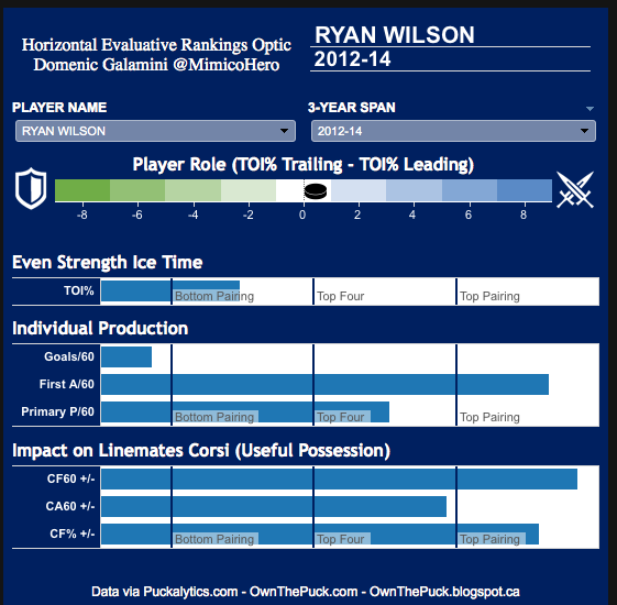 For those unfamiliar, the “CA60” stands for corsi against per 60 minutes of ice. Wideman’s poor rating here indicates the opposition tends to get a lot of pucks on net while he’s on he ice.