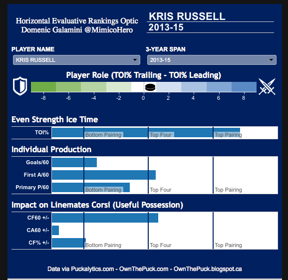 The Rusell/Wideman duo is a chaos pairing. They spend a lot of time dodging rubber in their own zone and have to hope they can out-block and out-score their defensive issues. They also place a huge burden on the other pairings because they have to be much more carefully managed at ES because of these issues.