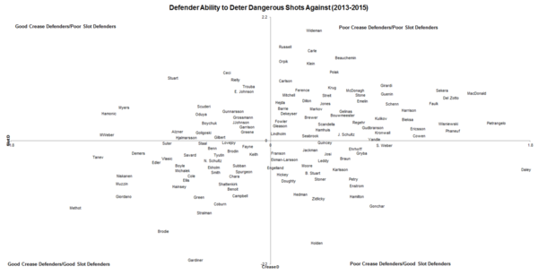If you can’t quite make that out, Dennis Wideman has been one of the worst defenders in the league at preventing shots from the slot and crease over the last few seasons. That accords with his HERO Chart results as well: