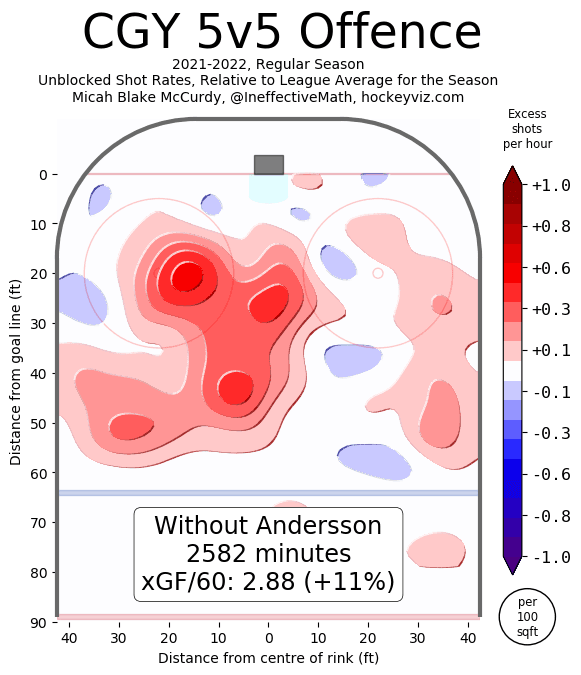 These two charts here show how the team creates offence as a unit when at 5v5. It says right there with/without and the sheer amount of disparity in attempts shows how valuable Andersson is at keeping the Flames attack alive. He’s crucial along the right side boards as an outlet when the forwards get in trouble down low. The fun part is to notice that when Andersson is out he’s not taking point shots – he’s deferring to Hanifin or getting it to his forwards for more dangerous attempts from the slot.