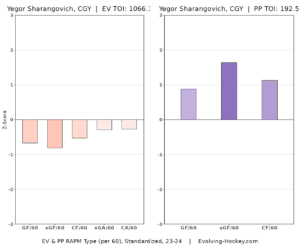 The interesting part about Sharangovich’s season is the regularized adjusted plus-minus analytics weren’t as high on his production as the box score or many people are. On the man advantage is where he really took charge, according to Evolving-Hockey’s data, but at even strength, he was not as effective as he should have been: