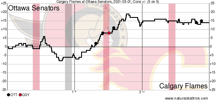 When teams play confident and dynamic hockey focused on generating genuine opportunities to score, they give themselves the best odds to stumble onto positively delicious chances. While the game was even and the Flames were making creative offensive plays with the puck, it seemed like a goal was inevitable. But before they could capitalize on the right bounce springing from all these promising creative chances, Ottawa spun the story around.