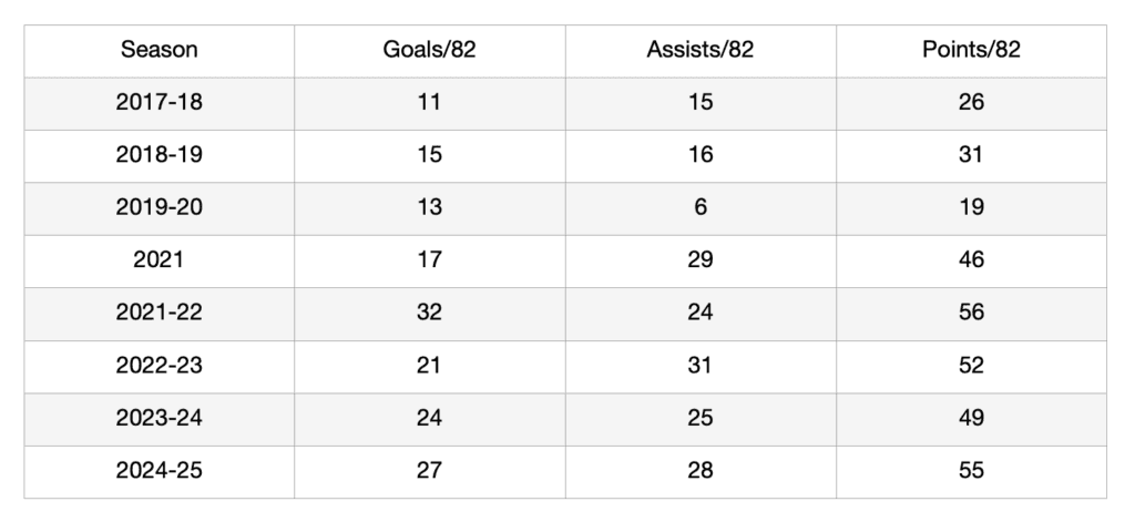 He has a tendency to miss time with injury. He’s only played in 80 or more games two times in his career, and those were both with the Flames in 2016-17 and 2017-18.