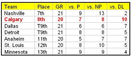 3) The Flames have nine home games remaining compared to 12 for the Predators, Stars, Red Wings and Ducks. Only the Blues, who like the Flames have actually been better on the road, have fewer home-ice dates left on the docket (eight) than Calgary.