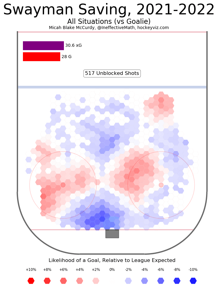 What Jake Oettinger has done so far this year has been impressive. He’s caught his own GM’s eye as well – as such the Dallas Stars put Anton Khudobin on waivers (he has since cleared, but remains on the trade market). Stuart Skinner has put up decent save numbers himself, but his NHL body of work is limited, meaning we only have a decent NHL sample from this year to work with. Swayman has posted similar numbers and he’s held them now for over two seasons.