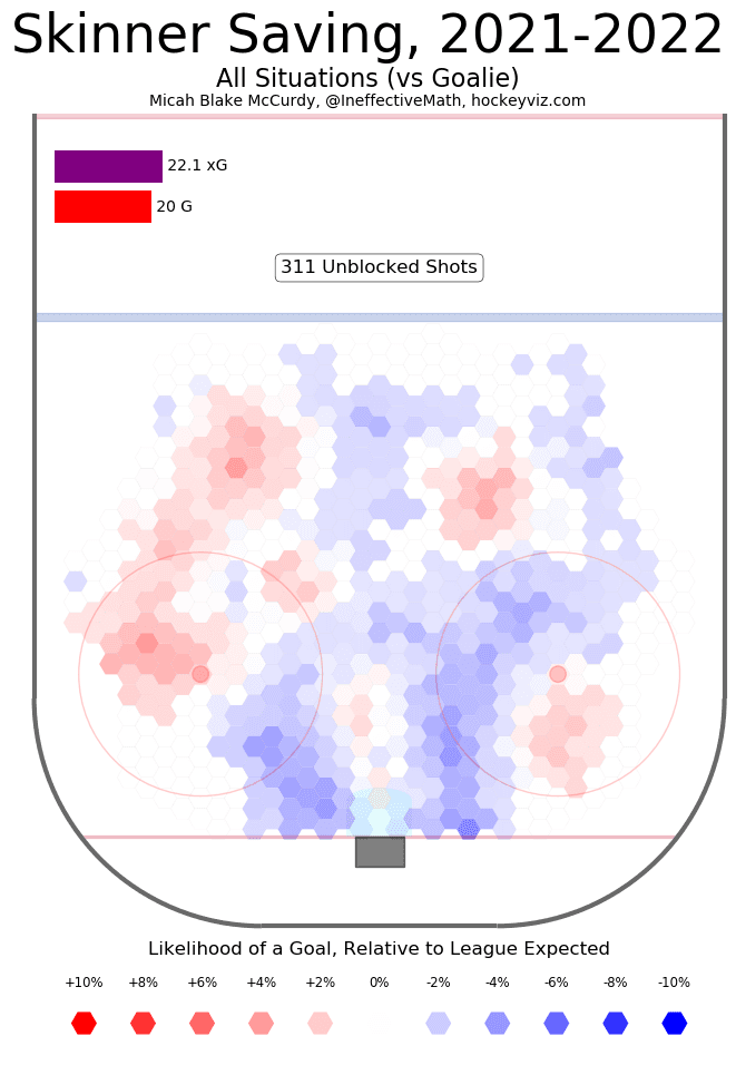 Using HockeyViz.com we can see which players this season have been adept at stopping high danger chances, and see the strengths of each goaltender. Only one has allowed more goals against than expected – young Spencer Knight. It’s not like he’s been allowing them from far out either, most of his goals have come from in tight against him. In an International competition going up against the best of the best a player currently letting in goals from that location is not ideal therefore i have chosen to leave Spencer Knight off the final roster.