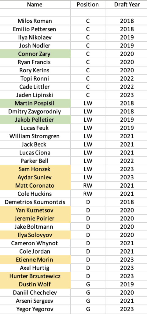 If you take a look at the draft history of the Flames from 2018-2023, the Flames already have three impact makers: Connor Zary, Martin Pospisil and Jakob Pelletier (green). There are another nine who I think have the potential to be true difference makers for the Flames within the next 5-10 years (yellow).