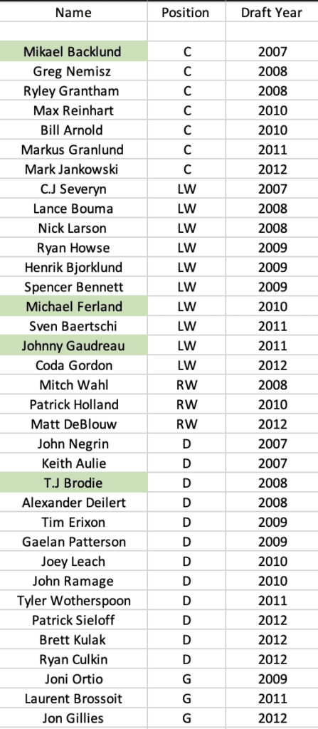 Here is a list of prospects the Flames had drafted between 2007 and 2012 who were in theory supposed to be part of the next core group of players. (I am not including the 2013 draft class because the 2024 draft is the equivalent for this iteration of the Flames rebuild.)