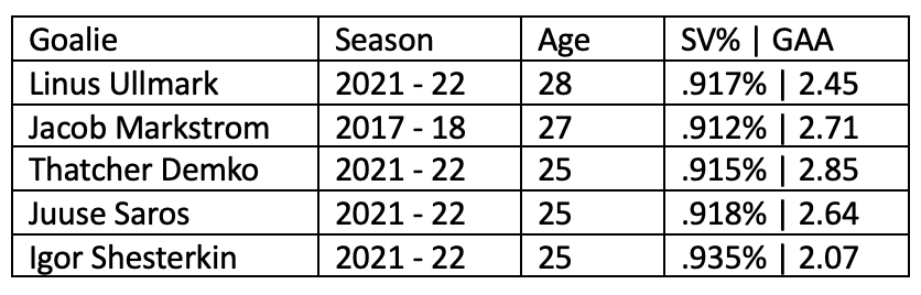 Finally, takes some goalies a long time to develop. Just take a look at the age when the top goalies in the NHL had their breakout seasons.