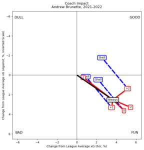 Essentially, there’s a whole lot of action happening under Brunette, with the x-axis in the visual being the change relative to the league average in xG for and the y-axis being the change relative to the league average in xG against.