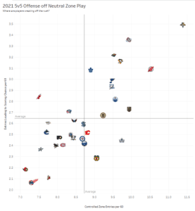 Sitting comfortably above the second standard deviation and around the third (about 95% better than the average) is nothing but impressive. Not only did the Panthers do an excellent job of creating offence in the zone, but they did it by playing a fast, transition-based style of hockey. Below is a visual brought to us by Corey Sznajder of All Three Zones, and it’s not too tough to see that Florida loved their possession zone entries and those possession entries lead to tons of scoring chances.