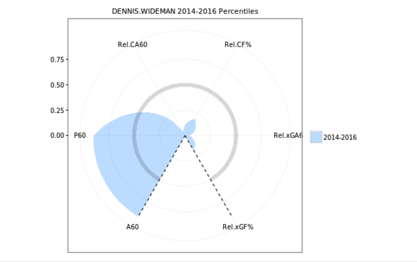 I added in Wideman’s assist and point rates from the last two seasons against his various relative possession and expected goals against stats for the sake of contrast. As you can see, Wideman is above average when it comes to scoring, but gets run over south of the redline.