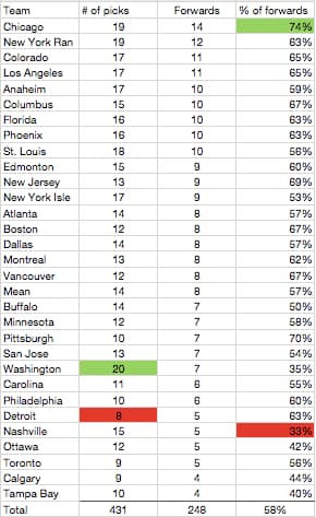 To add some context to those numbers, I went through each draft since Sutter took over to determine how other teams were picking over that span: