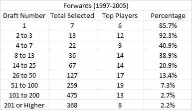 I used a recent post by Scott Reynolds for a basis of this investigation. He recently looked at drafts between 1997 and 2005 to determine the rate at which teams were able to find effective players at various positions. We’ll focus on his findings at forward for the purposes of this article.
