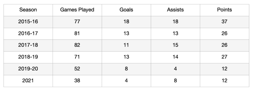 Some of his most common linemates from the 2016-17 to 2018-19 season were Mark Jankowski, Troy Brouwer, Kris Versteeg, James Neal, Mikael Backlund, Garnet Hathaway, and Derek Ryan. The Flames prioritized playing Mark Jankowski down the middle of the ice over Sam Bennett.