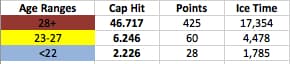 As you can see, a large proportion of the team fell outside of the professional peak age. The 28+ year olds (that’s the bad end of the curve) scored 83% of the points, ate up 73% of the cap budget and accounted for more than 70% of the ice time. In contrast, players near or entering peak age accumulated about 19% of the ice time and scored a paltry 14% of total points accounted for.