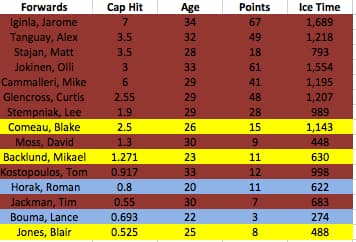 To make the problem more explicit, I put together the club’s roster from the recent season, including ages, cap hits, point totals and ice time: