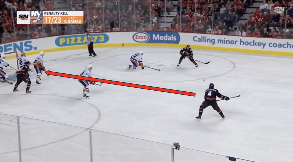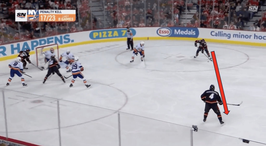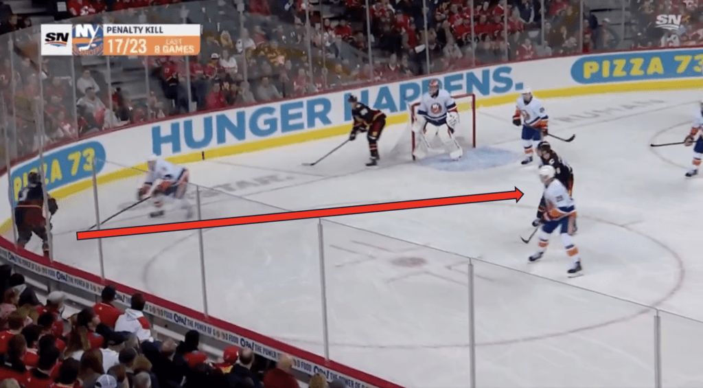 Backlund chases down the rebound and holds onto the puck. The Islanders’ penalty kill box drifts down towards Backlund. He passes to Pospisil in the centre of that box.