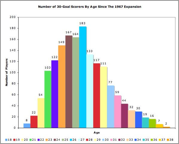 "Now, Iginla had 86 points last year. It’s not as though his goal-scoring abilities are going to dry up overnight, and that’s great news for the Flames. But it’s tough to say how much longer he can keep it up. Here’s a graph showing the number of 30-goal seasons by an individual player from 1967 through last season"