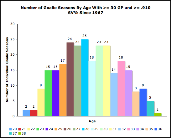 "That’s right. Not a pretty picture. Let me leave you with one last thought: how many goalkeepers put up better than a .910 save percentage and played more than 30 games in one season since the ’67 expansion? Well, the sample size is smaller, but basically, we’re looking at a grim outlook for a goalie turning 35."