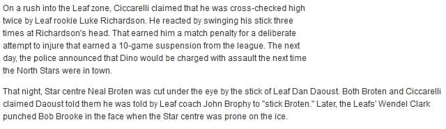 There’s plenty of other incidents in the archives, questions about who the best cheap-shot artist in the NHL is (including a player poll with that very question), complaints about guys taking cheap shots with sticks because they wear visors, Wayne Gretzky asking the NHL to outlaw fighting, and plenty of other fun stuff. Not only did I not look past the first five pages, I’ve omitted a bunch of stuff.