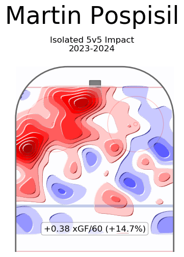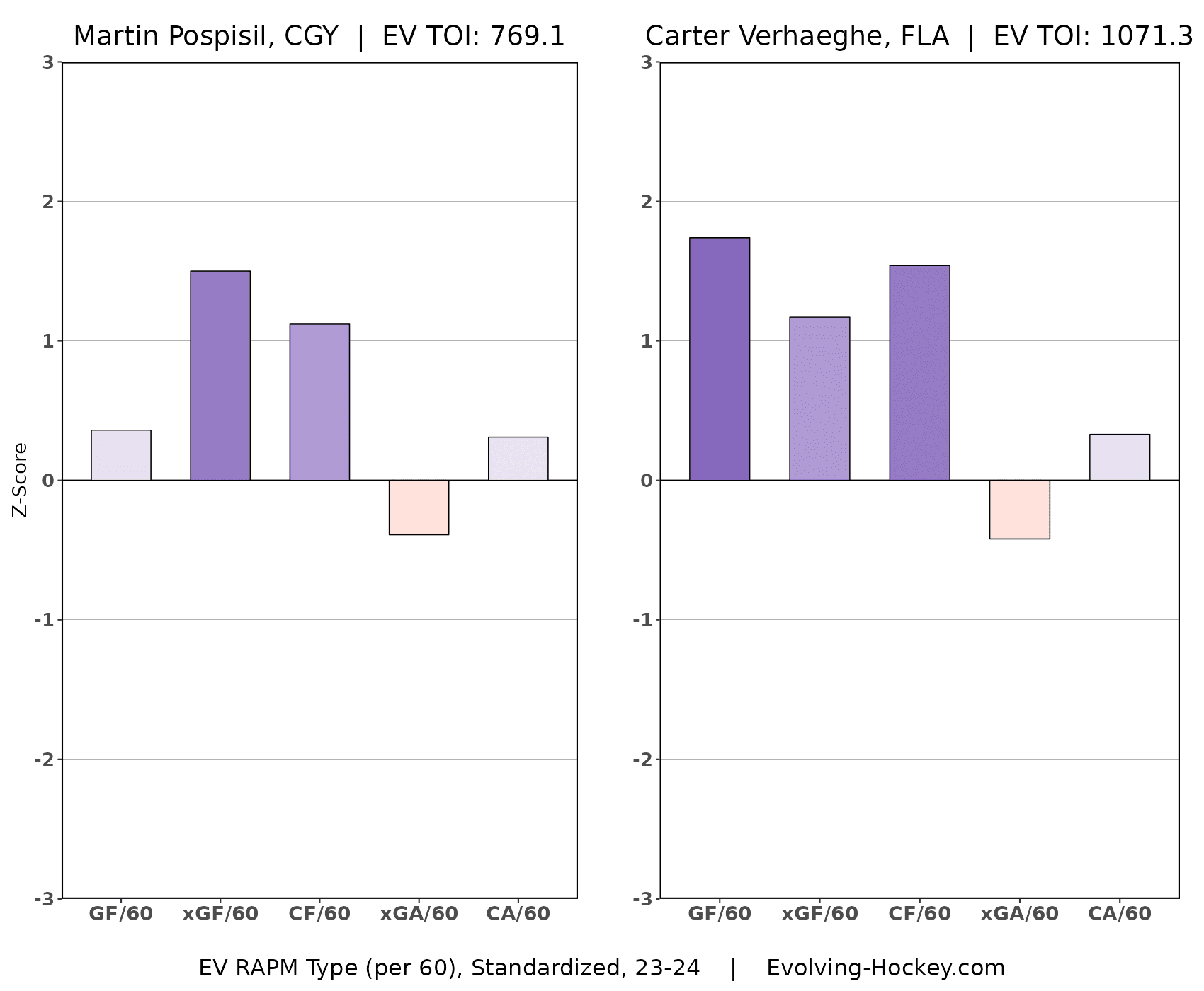 Regardless, offensively Pospisil contributed heavily in terms of generating chances. His offensive/defensive quality rates mimic another come from scraps story currently playing for the Florida Panthers. He certainly can’t shoot the puck like Carter Verhaeghe, but his impact on shot rates is very similar to what he’s producing.