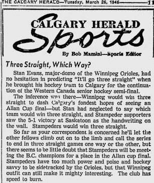 The Orioles were a formidable foe and featured former New York Ranger Max Labovitch. The coach of the Orioles seemed to also think that, despite their incredibly lame team name, the Orioles were going to make short work of the Stampeders. I’ll let the sports editor of the Calgary Herald from March 26, 1946 tell you the story of what happened in the first game: