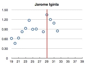 Jarome’s progression isn’t quite as tidy as Naslund’s, but the trends are there. Similar to the former Canuck captain, Iginla peaked a bit later than usual in his career with his 1.34 PPG season in 06-07 (94 points in 70 games) as a 29 year old. It’s been downhill since then, but with a couple of seasons at least in range of the apex.