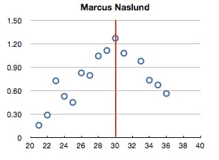 Naslund peaked at 30, scoring 104 points in 2002-03. He had two seasons within range before and after the apex, but as you can see, things went south pretty rapidly once he was on the wrong side of the big three-oh. He lost his 32 year old season to the lock-out (although he performed well in the SEL at the time) and was still a PPG player at 33, but fell precipitously out of the ranks of the elite after that point. He would go on to score 60, 55 and 49 points in his final three seasons (34, 35, 36 years old respectively) before ultimately retiring. The take-away from this is: despite dominating the league at 30, Naslund was nonetheless a medicore NHL player by the time he was 36 years old.