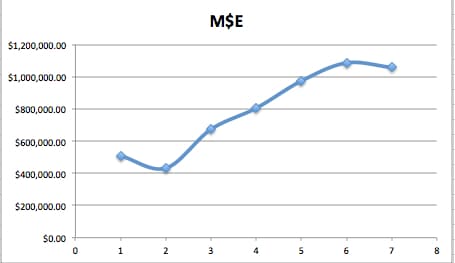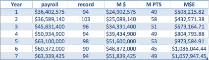 The table and graph show Sutter’s marginal spending (meaning dollars spent above the theoretical minimum-salary team of $11,500,000) and the club’s marginal points per season (points above a theoretical replacement level of 45). Of course, as this is an efficiency rating, the smaller the amount, the better. For the purposes of this investigation, I chose to use actual roster dollars spent rather than simple cap dollars since that seemed to be a more honest way to look at how Sutter was using his resources.