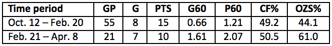 To illustrate that, it’s important to point out both Monahan and Gaudreau benefited from the formation of the line, too. What we saw was not just Ferland getting dragged around the ice by Calgary’s dynamic duo. The WOWY numbers below paint a pretty clear picture of how well the line gelled starting in February.