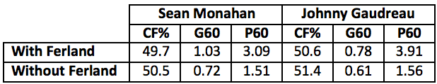 What is realistic, though, is for Ferland to have a productive season with Monahan and Gaudreau. Is he going to produce even strength points at the rates like he did above? No, probably not, mainly due to that shooting percentage, which ramped up to 18.0% in the 21 games he played with those two. However, that doesn’t mean Ferland won’t be a nice fit on the right side of the top line.