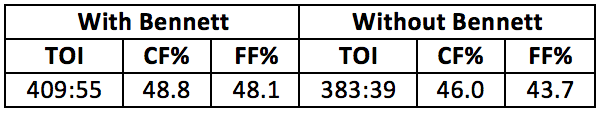 Beyond that, though, I think having Bennett paired with Kris Versteeg to start the season is a promising development. The pair worked well together last season and Versteeg played some of his better even strength hockey with Bennett as his centre. The WOWY numbers below are courtesy Natural Stat Trick.