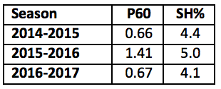 I’m curious to see how much powerplay time Bennett ends up getting, too. He averaged 1:14 of powerplay time per game during the 2016-17 campaign, which was more than a minute less than what Troy Brouwer saw each night. If Bennett sees a little more time on the man advantage this year, his points are likely to go up at a commensurate rate.