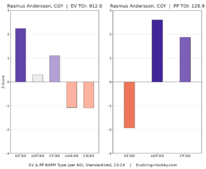 The problem for Andersson this season hasn’t been his even-strength play. The problem has been the power-play and the points he is producing there. I mean, just look at the disparity between the expected goals for per 60 (xGF/60) and the goals for per 60 (GF/60) in this chart from Evolving-Hockey.