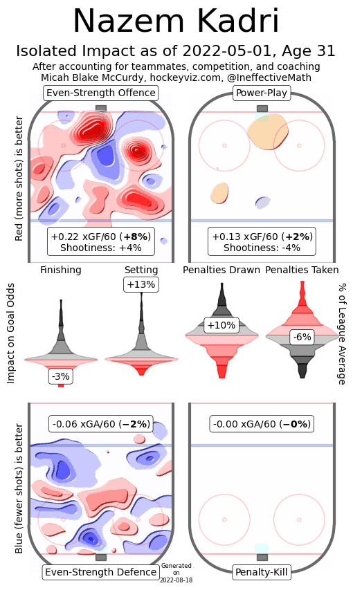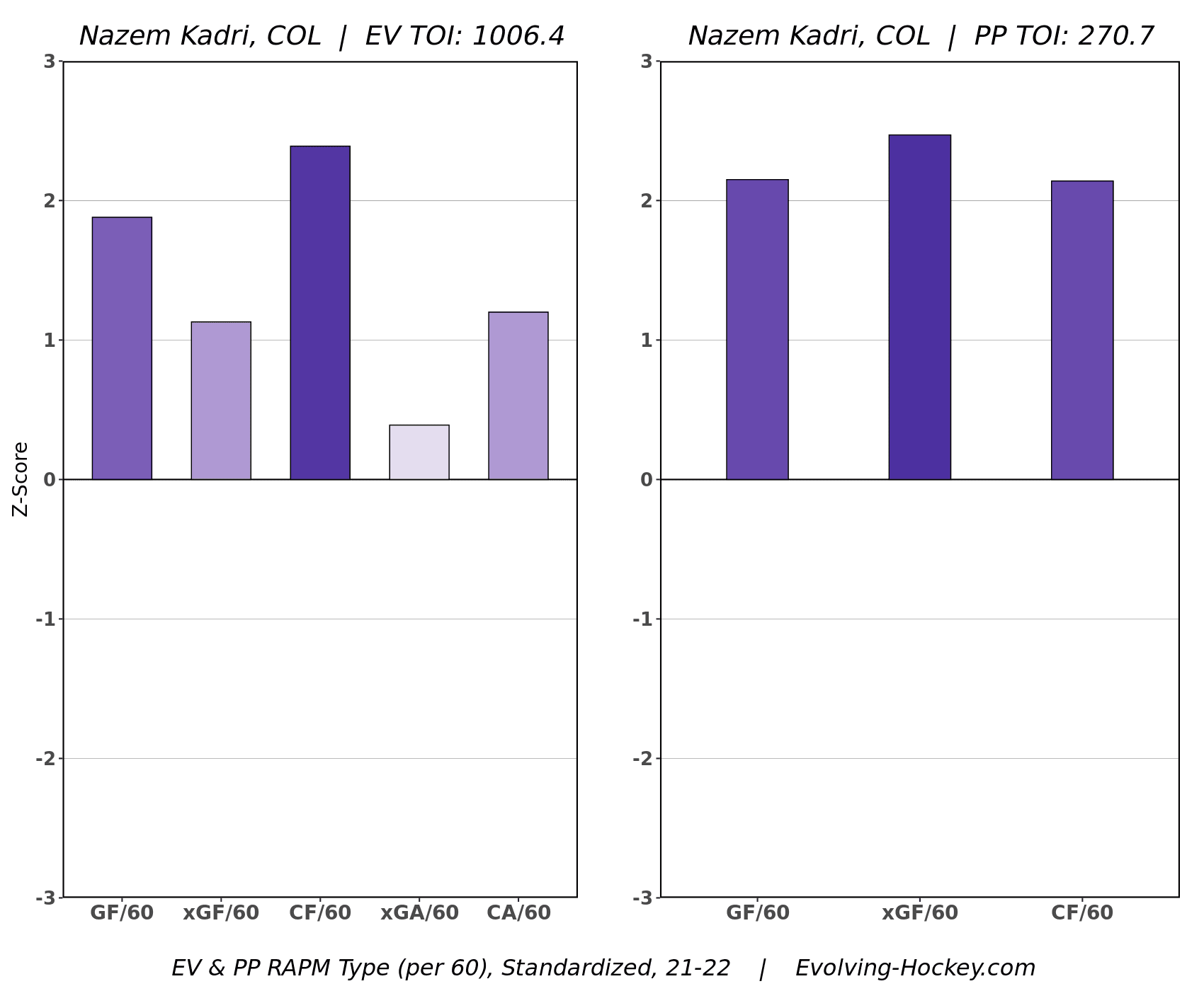 Here are Kadri's microstats from his "breakout" 2021-22 season. Lots of shots, lots of chances, lots of possession entries and rush chances, lots of pucks sent up to defencemen.