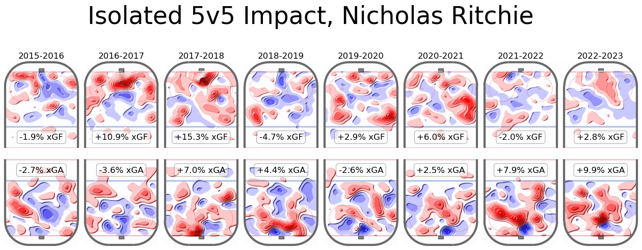 This is where Ritchie has become a red flag to some teams in recent years. The offence certainly has fluctuated and changed based on team and situation but his constant ability to be out there while the other team gets quality scoring chances holds true across his whole career. The only time it ever looked close to acceptable in the last 5 seasons was his time spent in Boston.