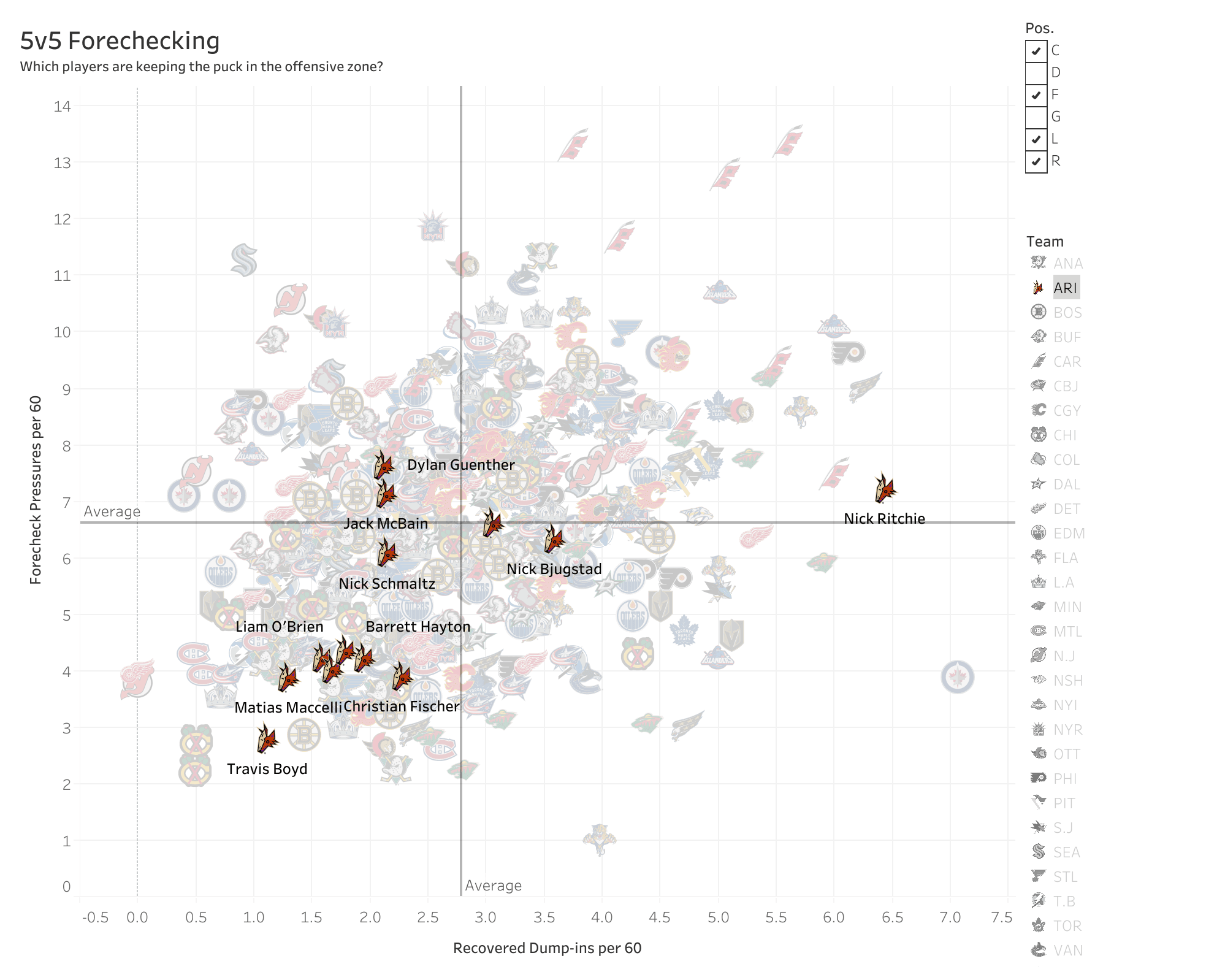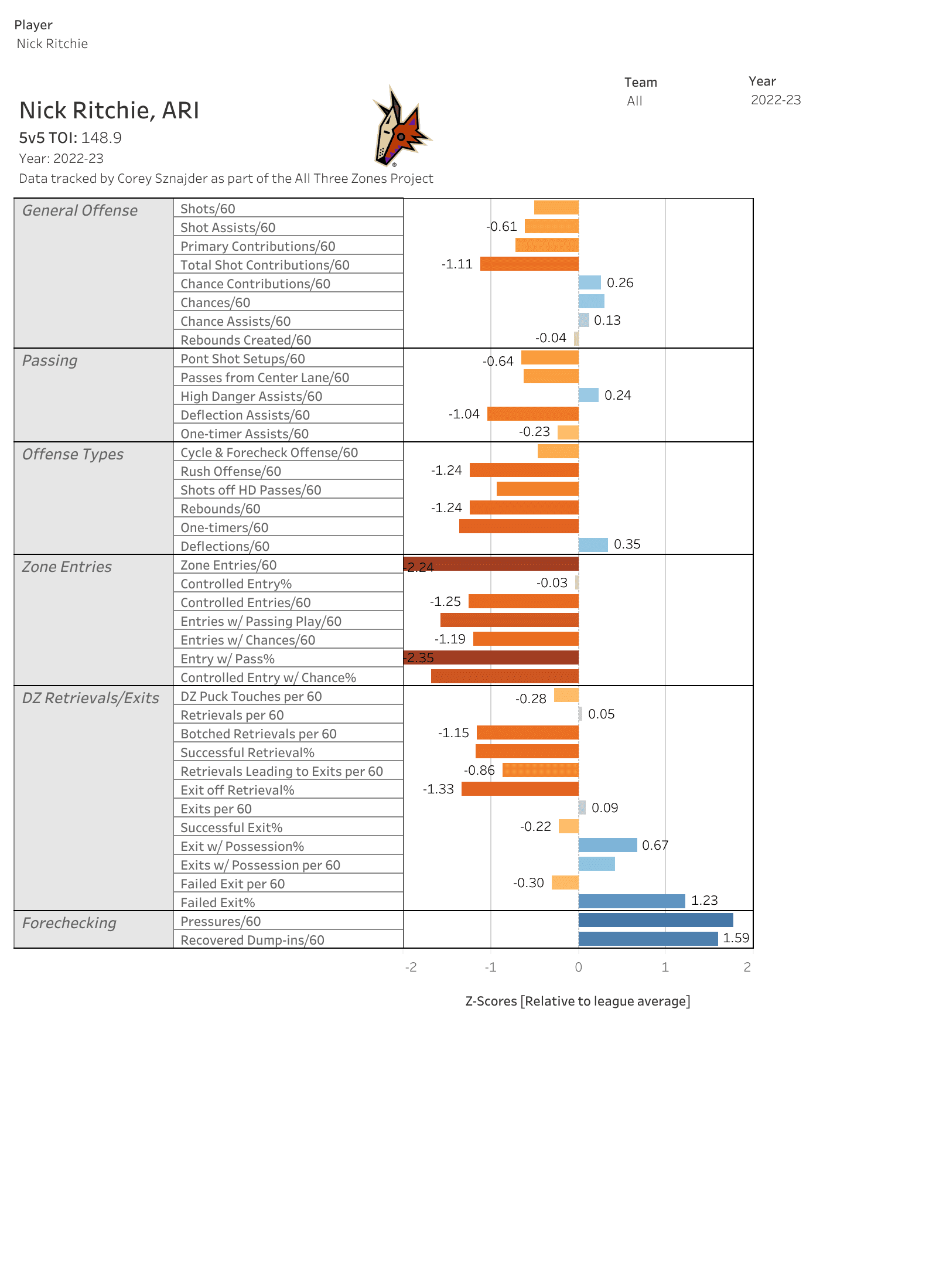I’m not going to sugarcoat things Ritchie does not help a line maintain possession through the neutral zone very well. He’s more of a dump it in and go get it kind of player rather than someone who wants to create rush offence. He’s actually one of the best in the entire league at gaining possession after a dump-in.