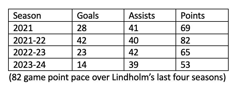 Lindholm can also produce offence. He’s produced at an above average rate, even in the seasons when he hasn’t played with Johnny Gaudreau and Matthew Tkachuk.