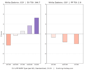 Yes, Zadorov is a physical presence on the blue line for any team that he plays for, but as of lately, he has taken a more advanced role outside of the physical side of things. The first piece I ever wrote here at Flames Nation was about Zadorov and his impact on the Flames, and the same sentiments that I wrote in that article hold true today. He’s a very capable defensive defenceman, just looking at his regularized adjusted plus-minus (RAPM) chart, and this season, he appears to have taken on the role of generating offence every once in a while. Let’s look at his RAPM chart and then a couple of clips.