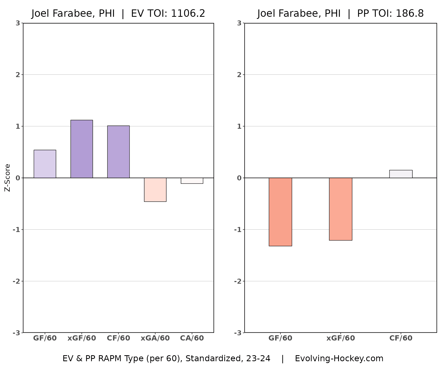 This was him at his peak value so far – just last season. There’s reason to believe the strong group the Flames have can get him to buy into what they are doing and get Farabee back to looking more like this than the other chart.