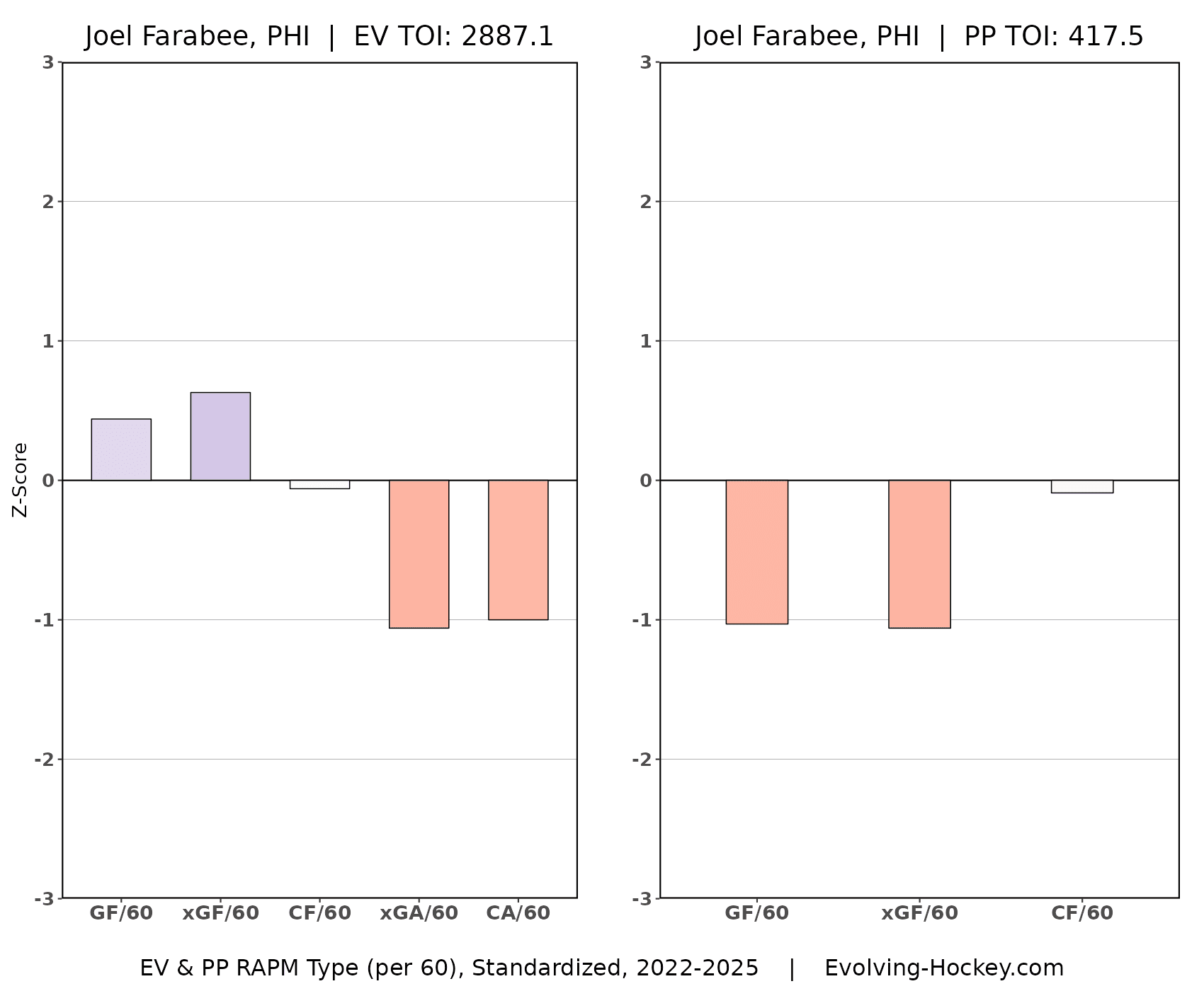 The Flyers – for instance – have an 11 per cent advantage in shot suppression with Farabee off the ice (xGA/60) vs. when he’s out there. If he was out there going toe-to-toe with Crosby consistently I would give him some leeway, but playing middle six minutes with PK time that ends up being too significant to ignore.