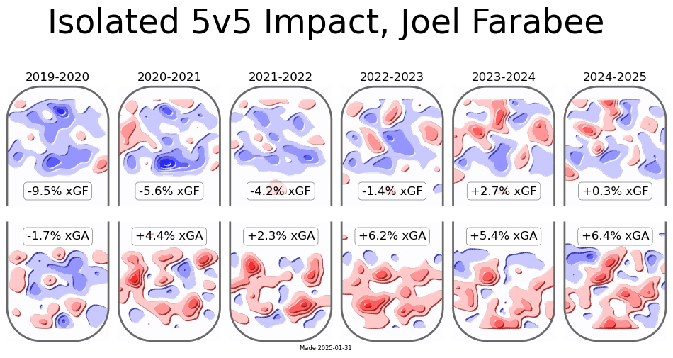 One thing I wanted to highlight while here – and I’ll dive into it more in the offence section – is that Farabee is showing a nice progression of improvement in xG and HDCF.