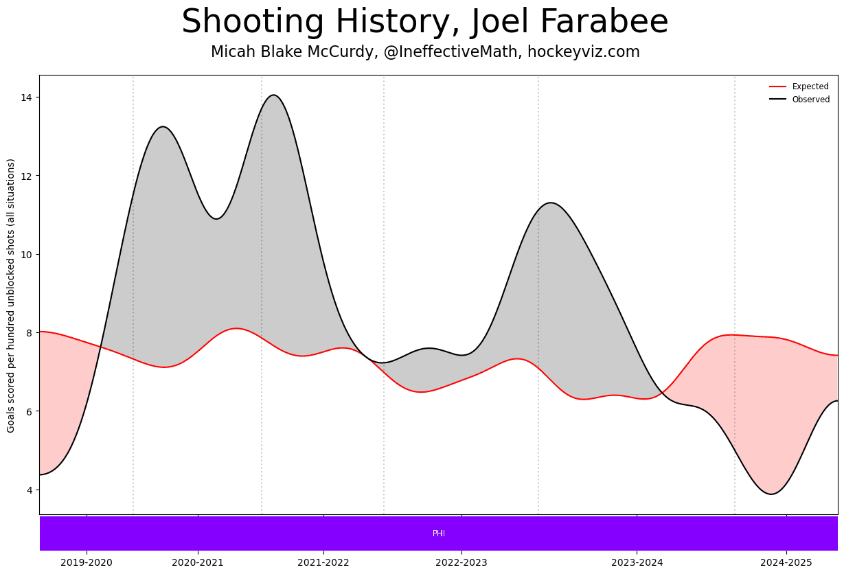 If you read the Frost piece you know that grey means you are outscoring the cumulative quality of your chances. Frosts weaved back and forth between red and grey but as we see here, until this season, Farabee was always well above average. He knows his way around the net.