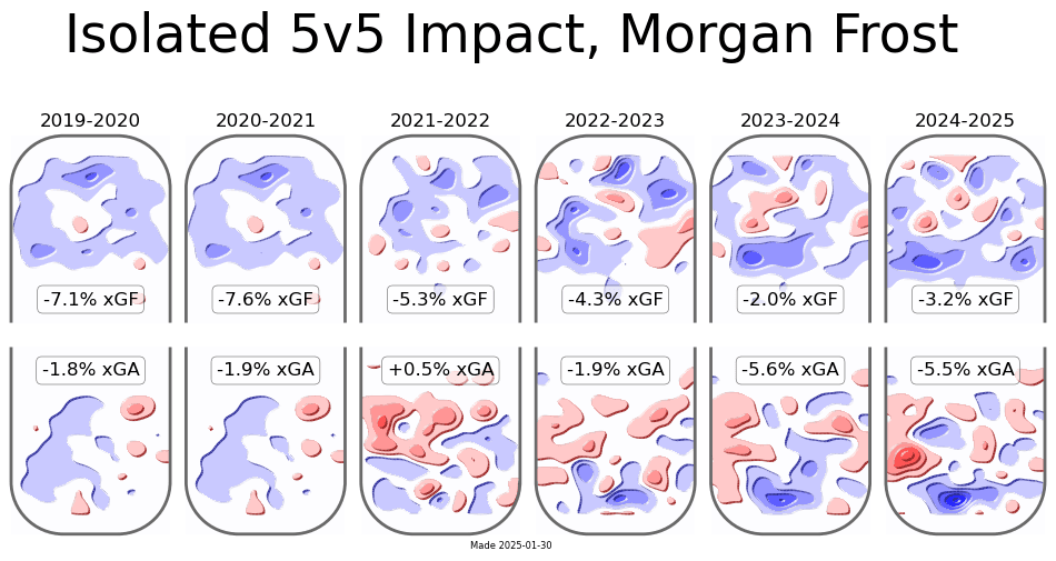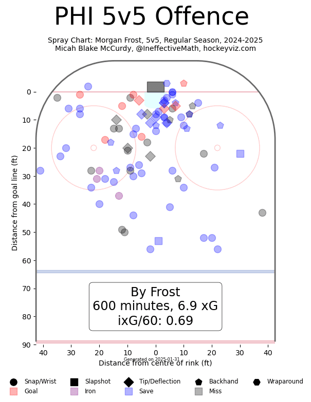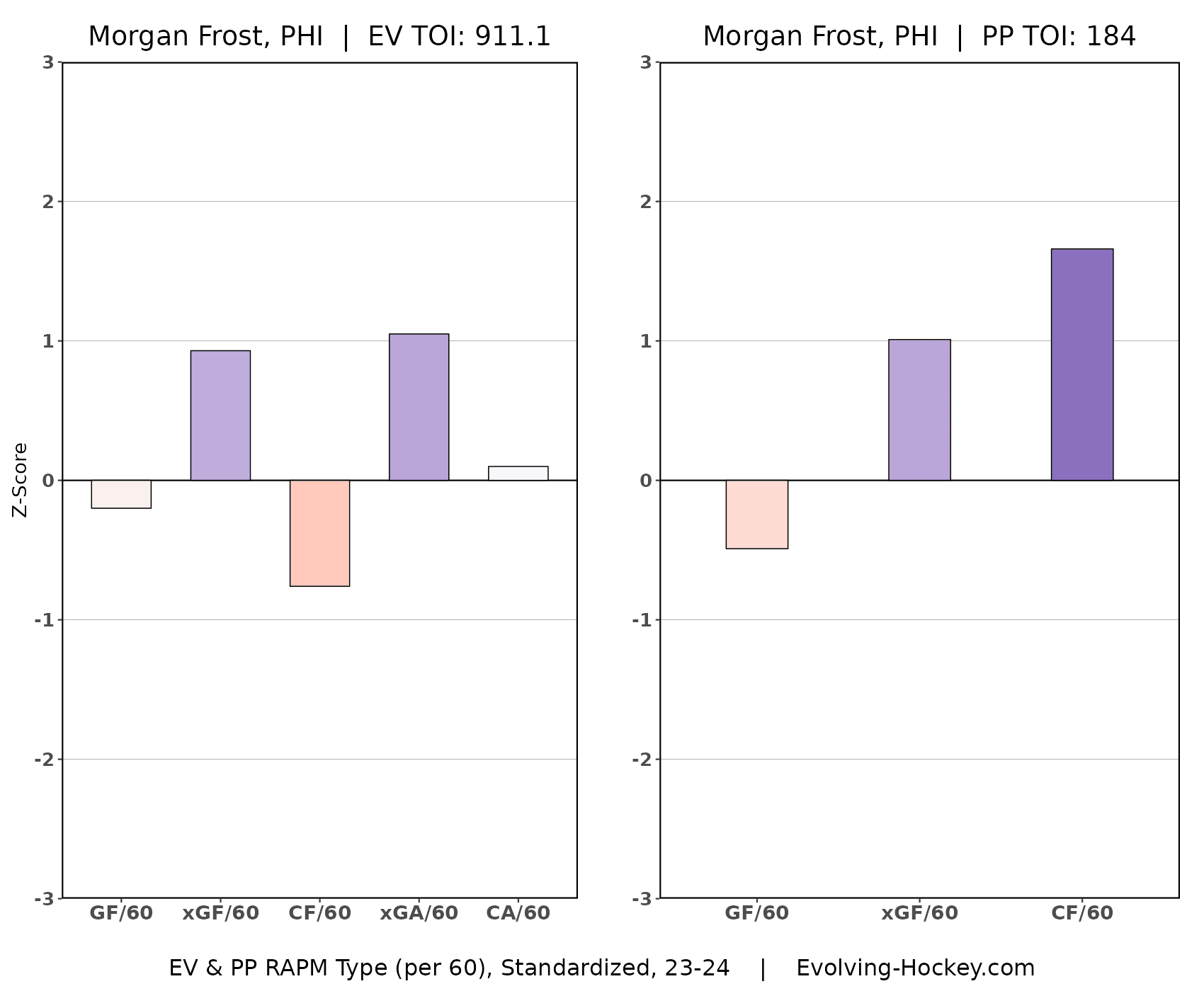 He has also shown when he’s been allowed to be free from defensive restraints to be quite productive – we can see that in his powerplay numbers. The last three seasons the Flyers have a much better power play with Frost on the ice – 16 percentage points in 2023-24 (referencing xGF/60)